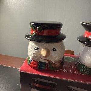 Vintage Ceramic Christmas Snowman Sugar and Creamer Set Trimmings Etc