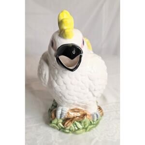 Add a touch of vintage charm to your home with this delightful ceramic cockatoo pitcher! This unique piece stands approximately 9 inches tall and 10 inches long, featuring a beautiful blend of white, yellow, and green hues. Perfect for serving your favorite beverages or as a decorative item, this vintage cockatoo pitcher is sure to be a conversation starter. Don't miss out on the opportunity to own this charming piece of art! Tropical, Rain forest, Juice, Water, Drinks, Floral Vase