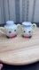 Charming vintage ceramic creamer and sugar set with playful faces. Features red bows and blue accents.