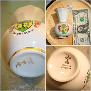 Vintage Ceramic Decor Porcelain Bud Vase Germany German Made Souvenir Vase: Trumpet shape with gold leaf accents along middle, top and bottom edge. Souvenir of Baumholder, Germany with city crest design on the front. MARK/Country of Origin: Germany. Good condition, no chips nor cracks.