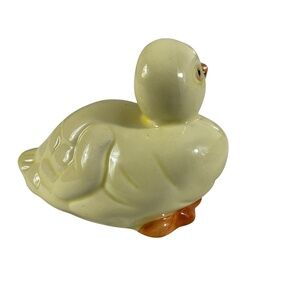 Adorable vintage ceramic duck figurine featuring a glossy pale yellow body, hand-painted orange beak and feet, and delicate carved feather detailing. This duck has a charming expression and compact size, making it ideal for farmhouse decor, nursery themes, springtime vignettes, or collectible displays.