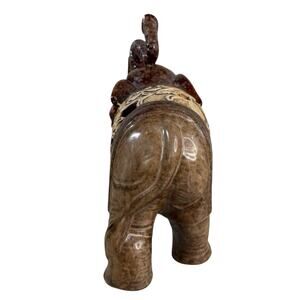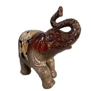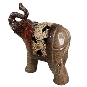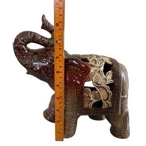 Vintage Ceramic Elephant Figurine Brown Red Glazed Filigree Cutout 7” Trunk Up