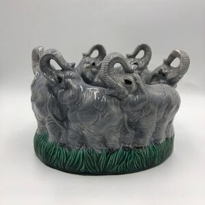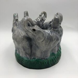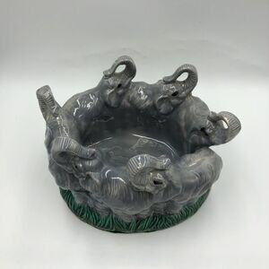 Vintage Ceramic Elephants Marching Bowl Trunks Up Decorative Tabletop Animal Decor. Bowl is vintage pre-owned. Please see all photos for visible condition. No original box. No noticeable chips/cracks. Felt on bottom. Actual brand unkwown. Previous owner stated is vintage - uncertain of what year. Approximately 7.75 inches wide x 5.5 inches tall x 6.5 inches. Very unique piece of art collectible.
