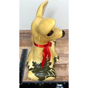 This vintage ceramic fawn figurine, adorned with a charming red ribbon and intricate leaf design, serves as a captivating decorative piece. Its elegant finish and well-crafted details make it an appealing addition to any collection or home decor, enhancing the visual ambiance with its timeless charm.