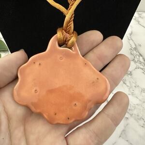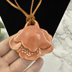 Vintage handmade ceramic pink poppy flower pendant necklace. It is free from any chips or cracks and is about 32 inches long. The pendant is about 2.5 inches across.
