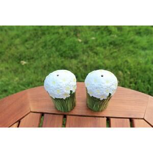 This is a cute vintage ceramic salt and pepper shaker set in the shape of white flowers and green stems.