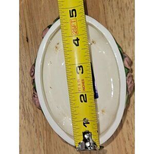 Ceramic dish measures 4 inches tall; silver tone box is 4 inches wide, 3 inches deep, and 2 inches tall.