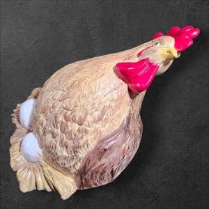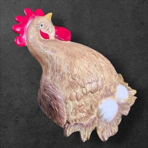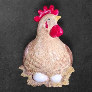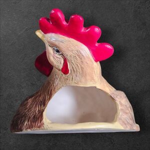 Heres one sassy hen ready to guard her eggs! This vintage ceramic wall pocket planter features a plump hen sitting on eggs, finished with bold red comb detail. Perfect as a farmhouse wall accent, utensil holder, or small planter for herbs and succulents. Its signed NS 85 on the back, suggesting it may have been a crafted piece from 1985. Theres one small paint chip near the head (see photos), otherwise no cracks or major damage; just plenty of vintage charm. Whether youre into farmcore, cottagecore, or just love chicken décor, this hen will bring personality to your kitchen or wall space.