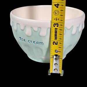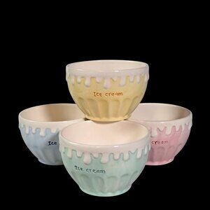 This listing is for a set of 4 vintage ceramic ice cream bowls made in 1999. These round novelty bowls come in yellow, blue, pink, and green colors, with a "dripping" theme and shiny finish. The ice cream bowls feature a retro theme and are branded on the bottom of each bowl -- Made Exclusively for the J.M. Smucker Company. Perfect for all occasions, these unique and colorful bowls would make a delightful addition to any vintage dish collection, kitchen or dining set.