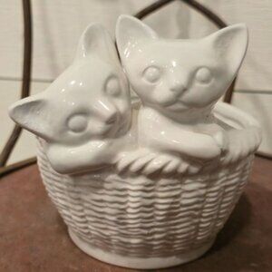 Charming vintage ceramic kittens planter in a basket, perfect for cat lovers. Use it as a vase or storage. Delightful addition to any decor.