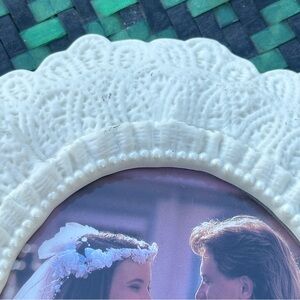 Vintage off-white ceramic photo frame with a delicate lace doily pattern and beaded pearl trim around the oval opening. Romantic Victorian-inspired design featuring a wedding couple insert, easily replaceable with your own photo. Perfect for bridal showers, vintage home decor, or a nostalgic wedding display. Freestanding with a black easel back. The frame insert is plastic, not glass.