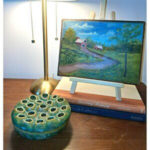 This vintage ceramic flower frog features a charming glaze and functional design. Its dual-purpose lid and arrangement holes make it an ideal floral arrangement piece.