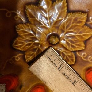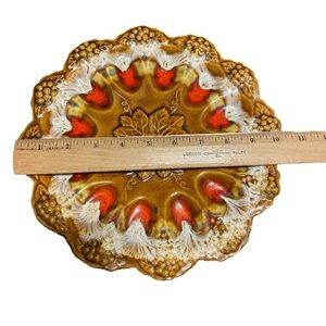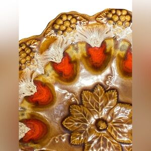 Beautiful vintage MCM ceramic egg platter. Features intricate floral patterns. Rich brown and red tones. Perfect for display or collection.