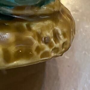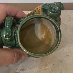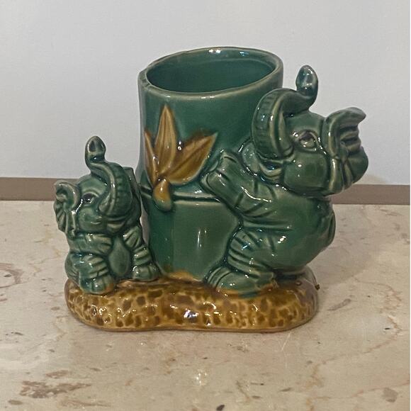 Vintage Ceramic Majolica Bamboo Planter Mama & Baby Elephants Trunks Up Green