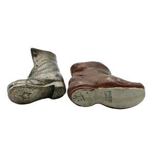 These charming vintage boot figurines showcase meticulous detailing and craftsmanship, one crafted from ceramic and the other from metal. A nostalgic addition to your collection.
