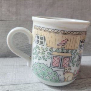 This charming ceramic mug features a delightful pastoral scene with cottages, cats, and birds. Its vintage aesthetic adds a rustic touch to your collection.