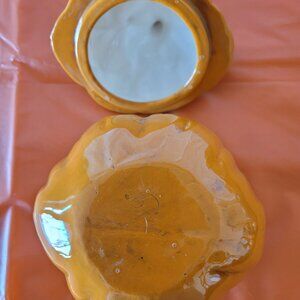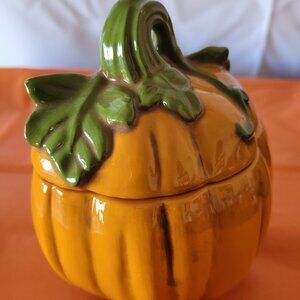 Ceramic Orange Pumpkin with Green Vines on Lid and Yellow Eyes and Mouth