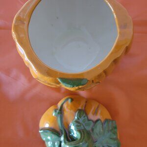 Vintage Ceramic Orange and Green Pumpkin Candy Dish With Lid