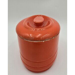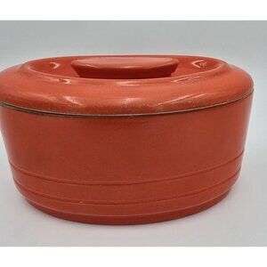 This vintage ceramic red/orange serving dish features a mid-century modern design with an oval shape and matching lid. Its glossy red/orange glaze adds retro flair, while its sturdy ceramic construction ensures durability for serving or display. Classic 1950s kitchenware with signs of gentle pre-owned use.