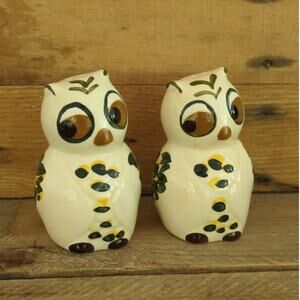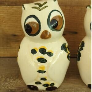 These are cute! A white owl with green and yellow feather highlights giving the side eye. They are pretty substantial measuring at 4.5" tall and 3" wide.