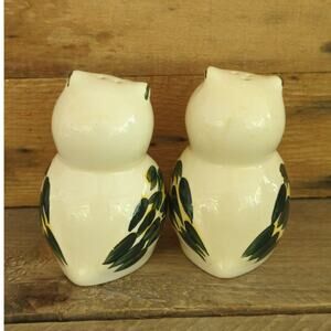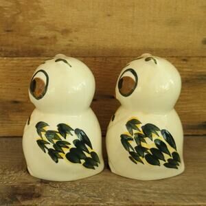 Vintage Ceramic Owl Salt and Pepper Shakers Green and Yellow Feathers Side Eye