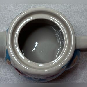 A jolly, hand painted and enameled Pottery Owl Teapot. This pot is in the shape of a darling, blue and off-white colored Owl with big black and orange eyes and mandala style raised enamel decorations all over...made by "Royal Pottery"