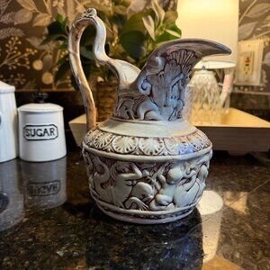 Vintage Ceramic Pitcher With Embossed Cherub & Nature Design Signed By P. Lewis