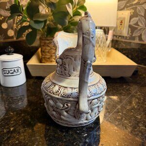 decorative pitcher, signed P. Lewis, 1978 pitcher, collectible ceramic, vintage decor, artistic jug, detailed pottery, unique gift, handmade pitcher, decorative accessory, vintage ceramic pitcher, embossed cherub design, nature-themed pitcher