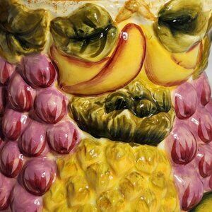 This vintage ceramic pitcher showcases a vibrant embossed design of fruits, including grapes, pineapple, and apples. Its hand-painted details and sturdy handle make it both functional and decorative, ideal for adding a retro charm to your kitchen or display collection. A timeless piece reflecting a bygone era.