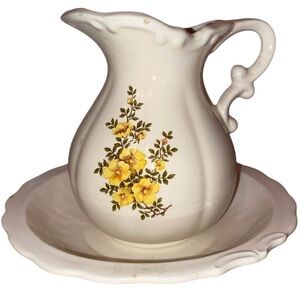 Vintage Ceramic Pitcher and Water Basin in White w/ a Yellow Floral Print