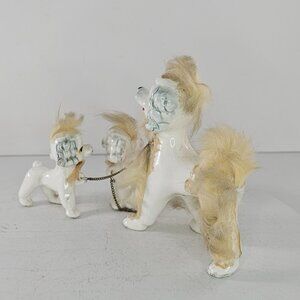 Vintage Ceramic Poodle Family Figurines Chain Fur Accents Japan