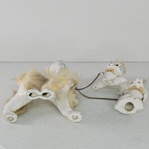 Charming vintage ceramic poodle family with fur accents. Features mother and two puppies linked by a chain leash.
