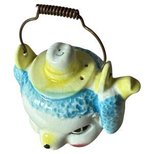 This delightful vintage ceramic shaker is shaped like a tiny teapot with a winking poodle face, floppy blue ears, and pink cheeks.
