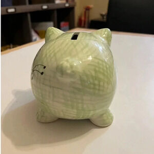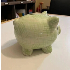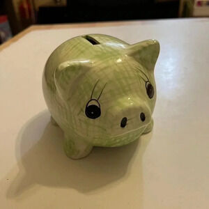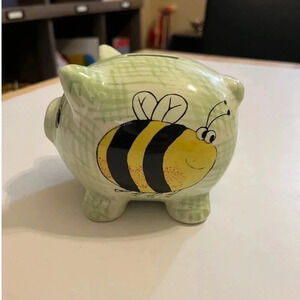 Vintage Ceramic Pottery Pig Piggy Bank Coin Change Green Check Bee Bumblebee
