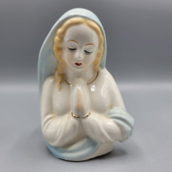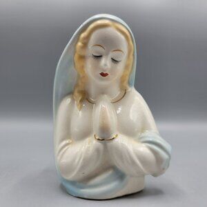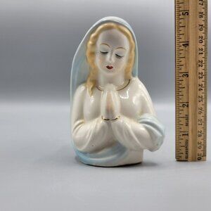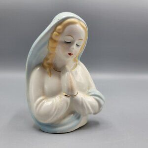 Vintage Ceramic Praying Virgin Mary Figurine Vase Blue White Religious Decor 4.5