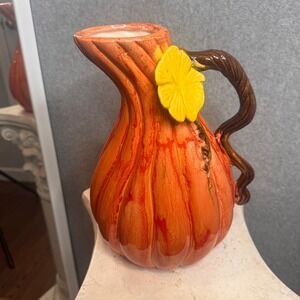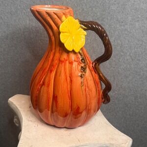 Vintage Ceramic Pumpkin Pitcher Orange Fall Decor Floral Accent Jug