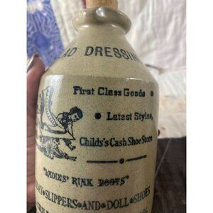 Measures 5 3/8" tall without the cork. This charming vintage ceramic bottle, adorned with a nostalgic advertisement for "Ladies' Rink Boots," is a unique decor piece.