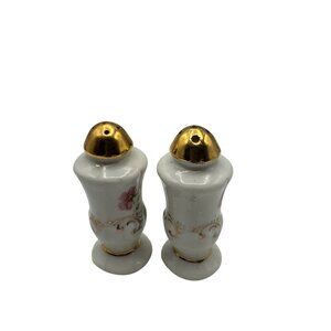 Elegant vintage salt and pepper shakers featuring a delicate floral design and gold-tone tops. Add timeless charm to any dining setting.