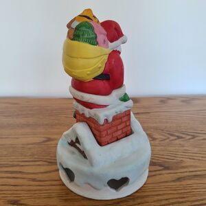 This charming vintage ceramic bisque tealight candle holder features Santa Claus climbing down a chimney with his sack of toys.