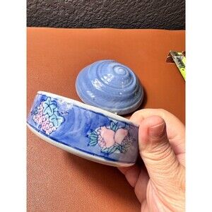 Vintage Ceramic Shell Trinket Box Blue Glazed with Floral Design Lid Coastal Dec