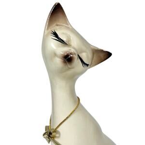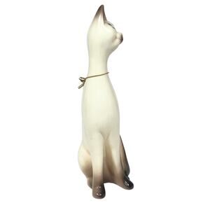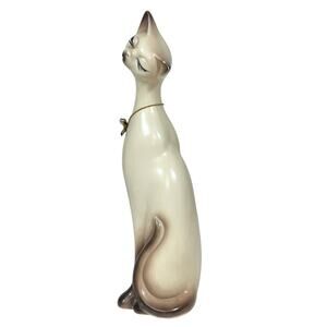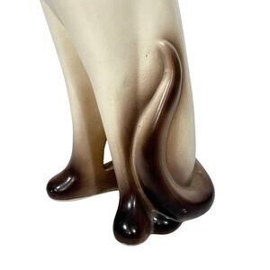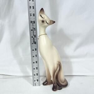 Introducing a Vintage Ceramic Siamese Cat Figurine, measuring approximately 12 inches and featuring brown and cream white coloring. This 1972 collectible piece has a couple of chips on the ears and minor stains as shown in the pictures.