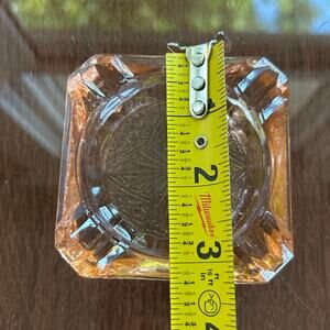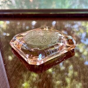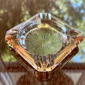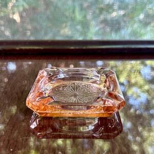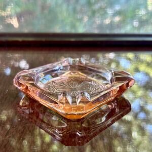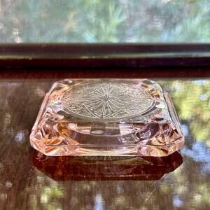 Vintage pink Depression-style glass ashtray measuring approximately 3.25” x 3.25”. This square ashtray features a raised starburst pattern at the center, faceted edges, and a soft pink tint that reflects beautifully in the light. Designed with four notches for resting cigarettes, it also works well as a small trinket dish or decorative vanity piece.