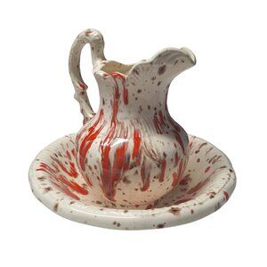 Vintage Ceramic Splatterware Pitcher Bowl Set Red White Spotted Design Drip