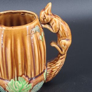 This ceramic pitcher/creamer is multiple shades of brown in the shape of an acorn and features a squirrel with a long tail for the handle.