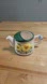Bring a delightful touch of farmhouse charm to your decor with this unique vintage ceramic miniature watering can. This piece is beautifully decorated with bright, embossed yellow sunflowers and delicate blue floral accents. The top features a glossy, deep green finish.