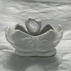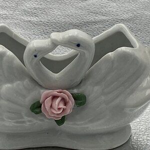 Vintage Ceramic Swan Planter Vase White With Pink Rose Accent Trinket Dish