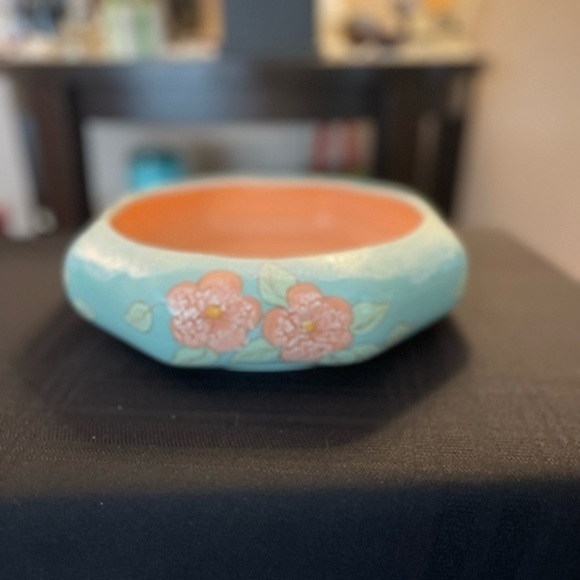Vintage Ceramic Teal & Peach Floral Artisan Bowl Planter Pot Dish approximately 9”x3”.