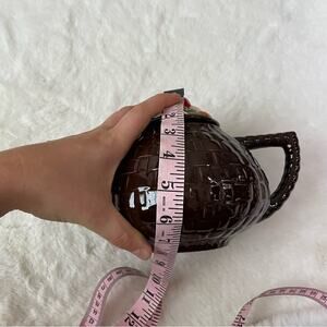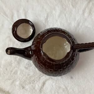 Brown basket-looking ceramic vintage teapot with colorful fruits on top. Great preowned condition. Measurements in photos.