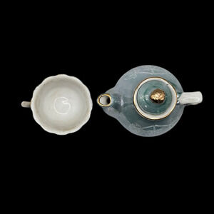 Vintage Ceramic Teapot & Cup Set Gray Blue Maple Leaf Motif Gold Trim Japan