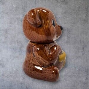 This adorable vintage ceramic teddy bear honey jar is as sweet as the honey it was made to hold. With its wide-eyed bear face, glossy brown glaze, and cheerful yellow honey pot belly, this little guy brings instant charm to any cozy kitchen, shelf, or cottagecore display.